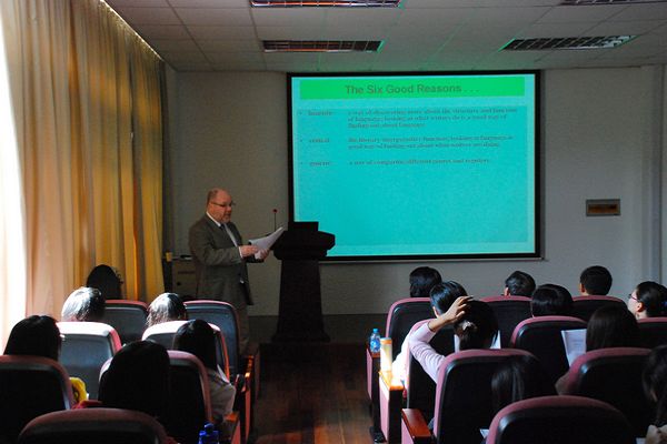 Paul Simpson教授首先对文体学的定义、研究的重要性以及文体学的主要分支进行了大致介绍,并以生动活泼、深入浅出的方式举例介绍了雅各布森的语言的诗学功能。之后,Paul Simpson教授论证了应用于文学作品语言分析中的一系列技巧,其中主要详细介绍了认知诗学中隐喻的应用。他从“常见的概念隐喻”、“具体化”、“创造性和隐喻的关系”等方面进行了生动详实的讲解。在讲解过程中,Paul Simpson教授引用了很多具体贴切的例子来帮助大家理解,激发了大家对文体学的浓厚兴趣。